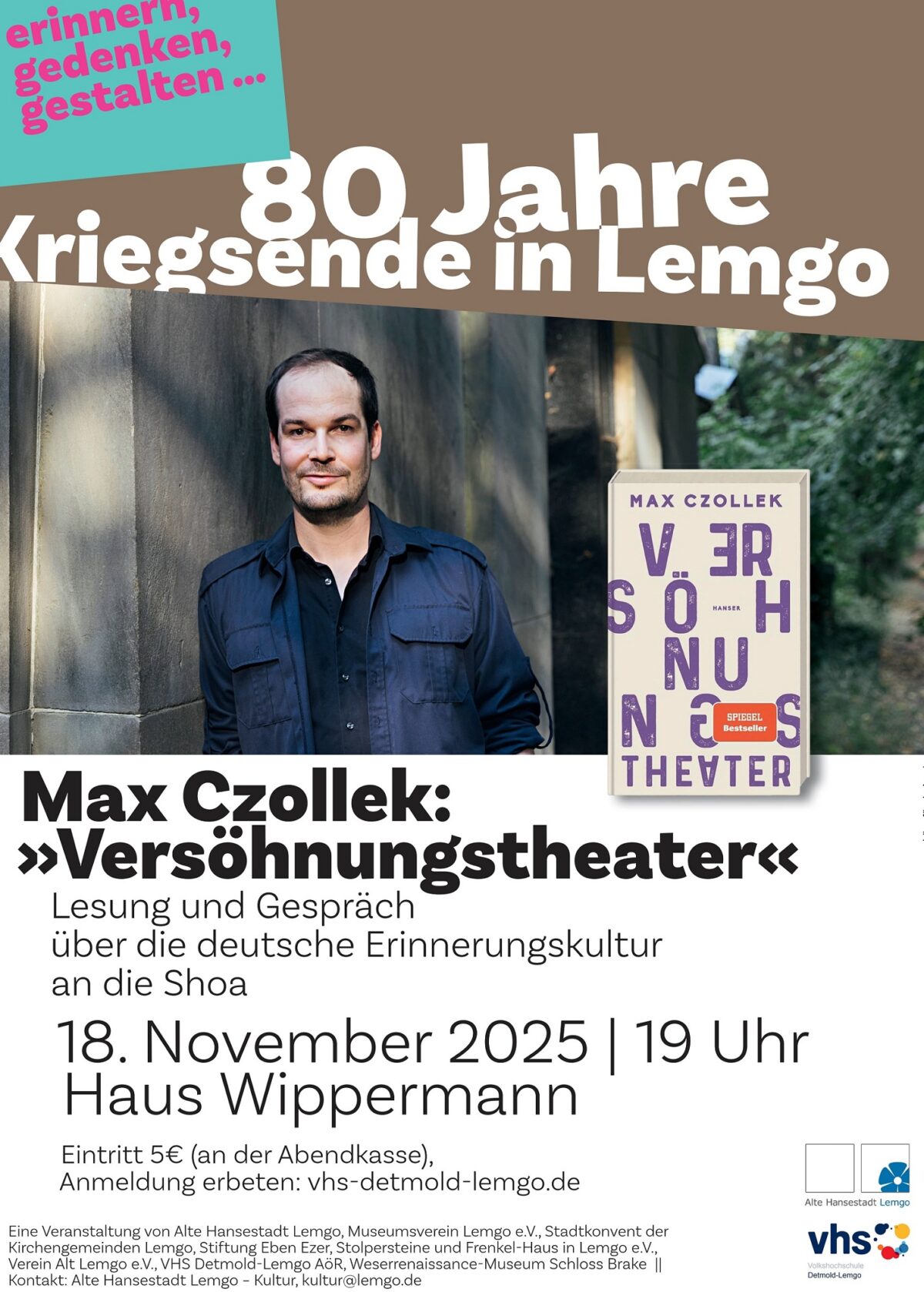 Die Gedenkstätte Frenkel-Haus und die Volkshochschule Detmold-Lemgo laden herzlich zur Lesung und Diskussion mit Max Czollek ein. Im Mittelpunkt des Abends steht die deutsche Erinnerungskultur. Max Czollek, der zuvor u. a. das vielbeachtete Buch „Desintegriert Euch“ (2018) veröffentlichte, liest aus seinem jüngsten Buch „Versöhnungstheater“ (2023) und zeigt auf, wie die Erinnerung an die Shoa im gegenwärtigen gesellschaftlichen Diskurs inszeniert, instrumentalisiert und vielfach neu verhandelt wird. Anhand kritischer Analysen eröffnet er einen reflektierten Blick auf eingeübte Gedenkrituale und Erinnerungspraxen. Im anschließenden Gespräch lässt sich beispielsweise gemeinsam diskutieren, wie künftig erinnerungspolitische Prozesse gestaltet werden können.
